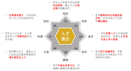 规划层面,要坚持人才引领发展,突出问题导向,将人才规划纳入企业战略规划体系;培养层面,将实践历练提到与教育培训同等重要的位置,突出人才梯队建设,强调“大培养”理念;选任层面,更多强调市场化选人用人机制的建设和完善;考评层面,突出实干实绩导向,强调分层分类考核,以成绩说话,以结果说话;激励层面,强调在薪酬机制、分配政策和激励方式方面,要差异化、市场化、多元化,拉开收入差距;引进层面,关键词是“靶向引才”,针对海外高层次人才引进,要坚持需求导向,突出高精尖缺;环境层面,强调创新创业环境和干事氛围、容错氛围的打造;组织层面,强调人才工作领导责任的层层压实。